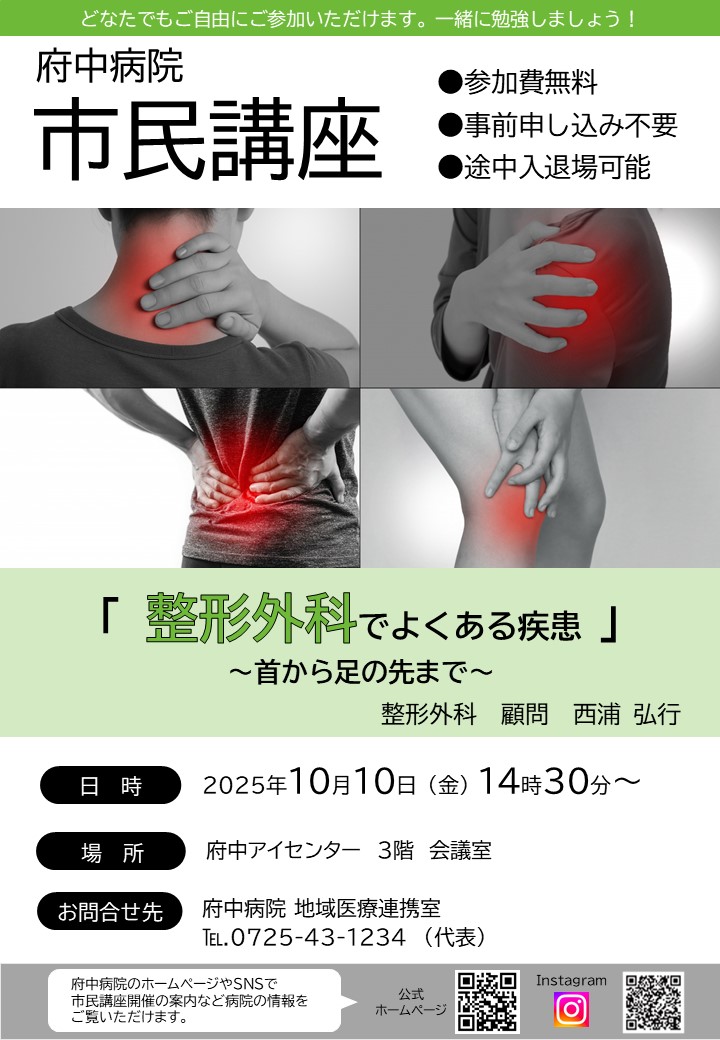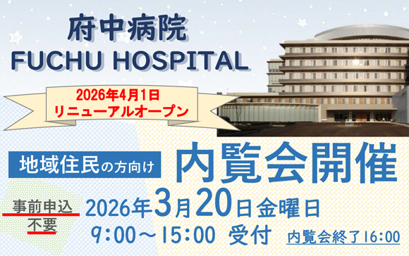 <地域住民の方向け>内覧会を開催します!【3月20(金・祝) 】 Z型2床室を導入しました 泉州初導入!最新型リハビリロボット機器「MELTz(メルツ)」 外来受診される方 初診・再診の方 外来担当医表 相談窓口 入院される方 入退院の流れ・手続き 入院中の生活 ご面会 診療・施設情報 診療科・部門 フロアマップ 交通アクセス その他のご案内 患者さんの紹介方法 市民講座 広報誌「ふちゅうのわ」 府中病院の特色 地域包括ケア 在宅医療や高齢者救急に対応し、医療、介護、生活支援が一体となったケアを提供。一人ひとりの「自分らしい生活」の実現をめざします。 回復期医療 回復期リハビリテーション病棟と地域包括ケア病棟を中心に、急性期治療を経過した患者さんへ治療やリハビリを提供します。 リハビリテーション 身体の機能回復だけではなく、患者さんが自分の生活スタイルや価値観に合わせて、充実した日常を送れるよう全力でサポートします。 専門医療 アイセンターや透析センターを備え、専門的な医療を提供します。 お知らせ 一般・患者さん向け 一般・患者さん向け 2026.03.02 お知らせ 病院HPをリニューアルしました 2026.03.01 お知らせ Z型病床を導入しました(2床室) 2026.02.10 お知らせ 【駐車場】車両ナンバー認証式導入と料金変更のお知らせ 一覧 イベント・セミナー 開催予定 イベント 202603/20 金 9:00~15:00受付 【地域住民の方向け】内覧会開催のご案内 府中病院は2026年4月1日にリニューアルオープンします 終了 薬局研修会 202602/28 土 15:00~16:30 第1回 泉州薬薬連携研修会 開催 終了 市民講座 202510/10 金 14:30~ 整形外科でよくある疾患 ~首から足の先まで~ 整形外科 顧問 西浦 弘行 一般・患者さん向け一覧 医療関係の方向け一覧