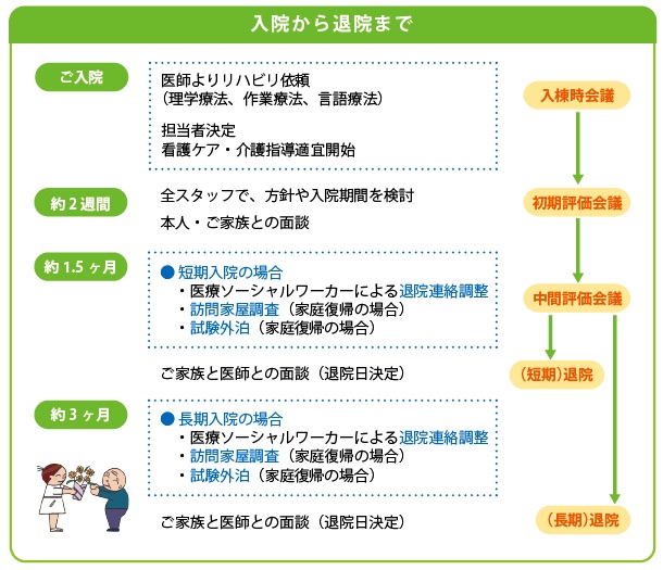 入院直後の会議(カンファレンス)とその後の定期的なカンファレンス、ご家族への説明と同意、家庭訪問、家屋改造、試験外泊、退院前の介護保険利用の計画、退院後の訪問チェックなどを計画的に実施しています。