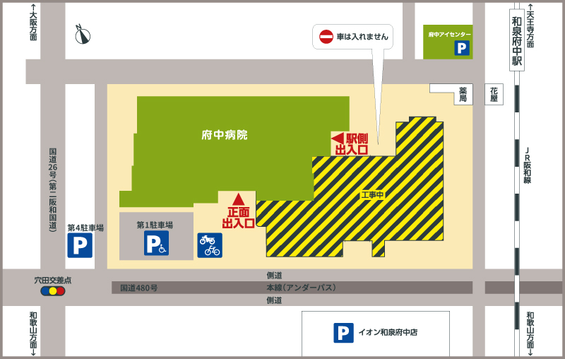 - 2026年4月1日より病院出入口は、正面と駅側出入口の2箇所に変更となります。