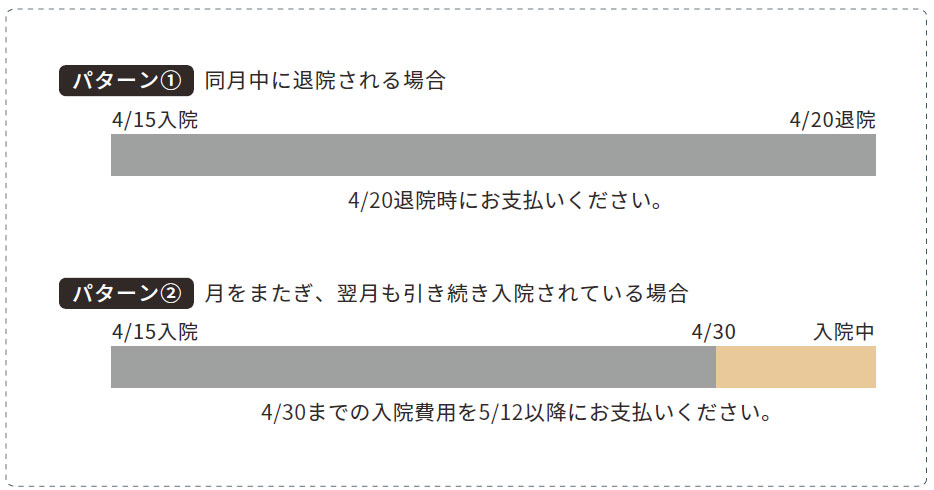 月をまたぐ入院の場合は、月末に締め、翌月12日頃に請求書ができあがります。お手元に届いていない場合は、お支払い場所にございますのでお声かけください。