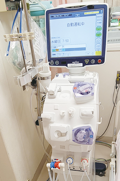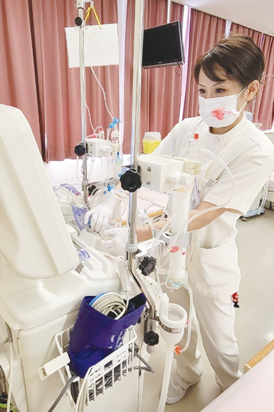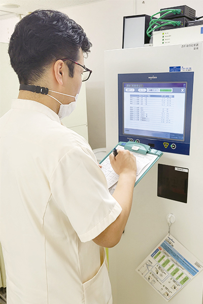 プライミングから穿刺・回収や血圧測定をはじめとする透析治療中のケアなどもおこなっています。 その他にも、透析関連機器全般(水処理装置、透析液供給装置、透析用監視装置など)の操作、保守・管理業務をおこなっており、日々の透析用水・透析液の水質確認、透析液の作成および調整といった透析液安全管理責任も担っています。