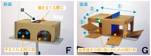 多くの場合、廃品ダンボールを使っての手作りです。鏡の設置がしやすく、鏡像への集中にもつながりやすいと思われます。
