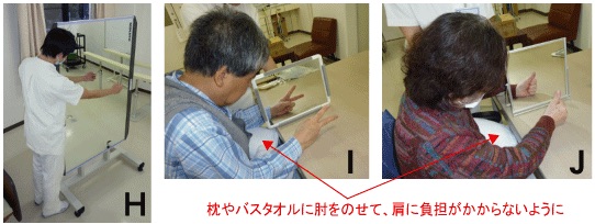 写真Hは、姿勢矯正鏡を利用した場合を想定しています。写真I、Jは、さまざまな鏡を利用した場合を想定しています。