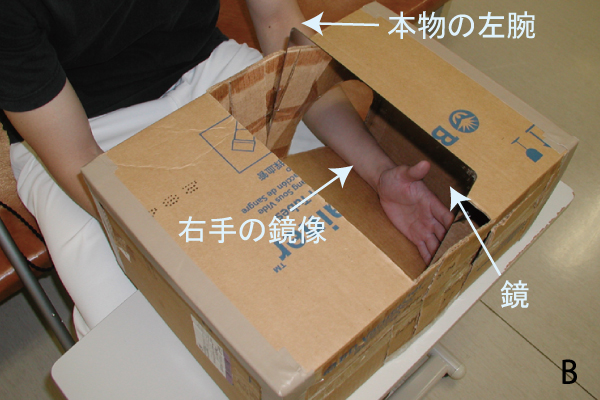 最近では、ミラーボックスなしでの方法も実施されています。大きさは決まっていませんが、身体正面で両手を入れて運動できる必要があります。また、箱の上面中央付近に鏡を立てる開口部が必要です。