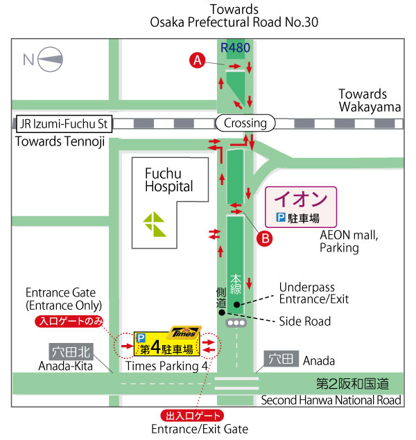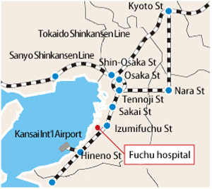 - From “Izumi-Chuo station” on the Senboku Rapid Railway: Take a Nankai bus (for Izumi-Otsu Ekimae) and alight at the “Izumi-Fuchu Ekimae” bus stop. It is about 3 minutes’ walk to the hospital.