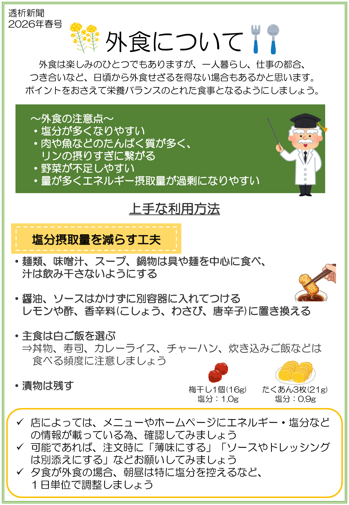 透析新聞 2026年春号 「透析新聞」 2026年春号を発刊いたしました。PDFをダウンロードしてご覧ください。 透析新聞 2026年春号[PDF] 今号の特集「外食について」 外食は楽しみのひとつでもありますが、一人暮らし、仕事の都合、つき合いなど、日頃から外食せざるを得ない場合もあるかと思います。ポイントをおさえて栄養バランスのとれた食事となるようにしましょう。 栄養管理室 fuchu-admin2026-02-19T09:35:59+09:002026年02月19日|お知らせ, 透析センター, 透析新聞|
